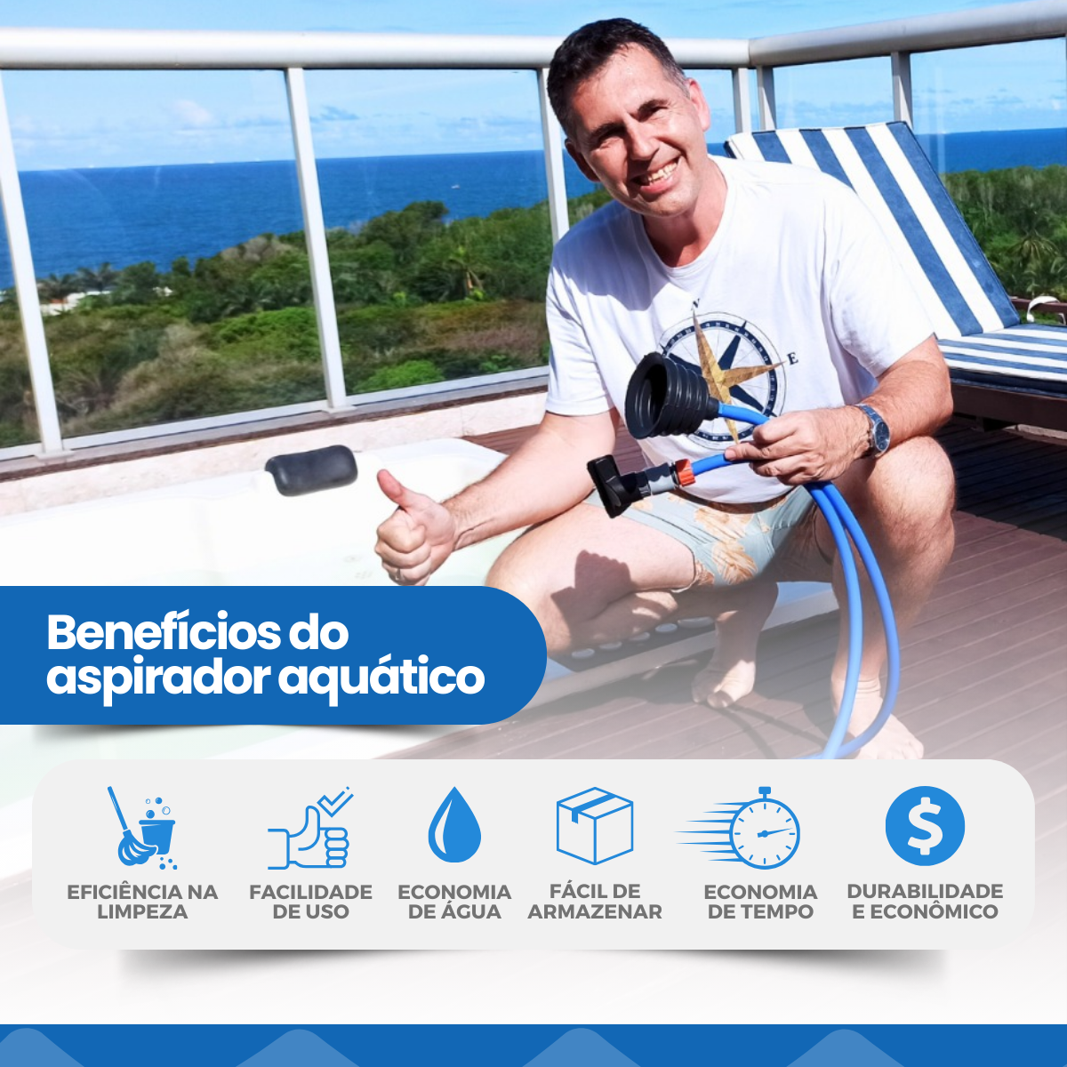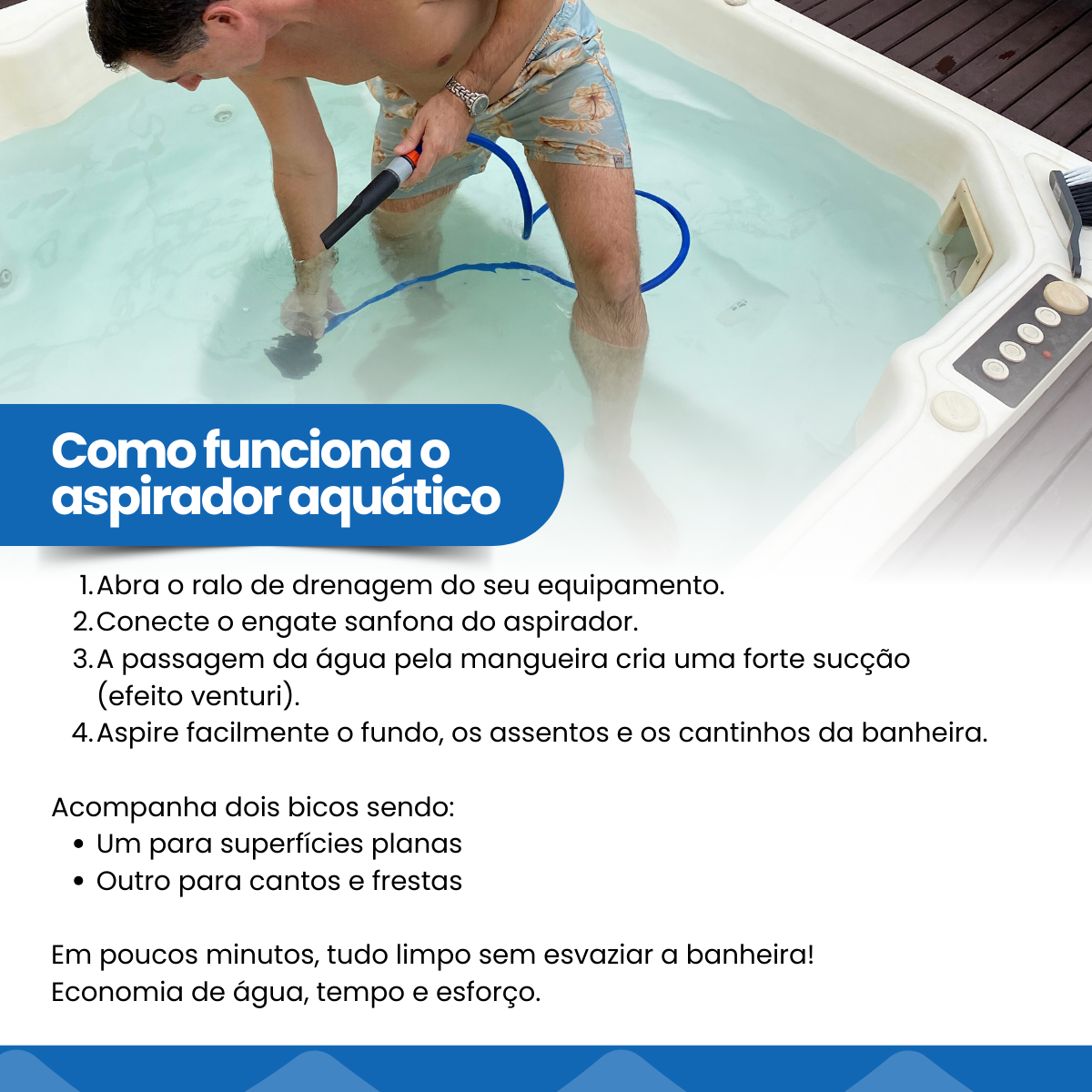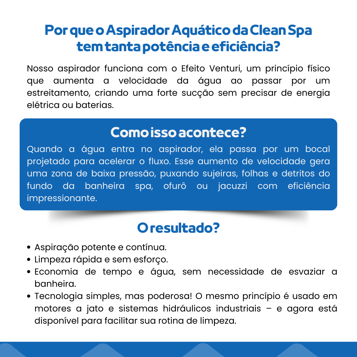 Conheça o aspirador aquático manual por sucção da Clean Spa! Ele é único e inovador pois desenvolvido especificamente para banheira spa, ofurô e jacuzzi. Ele oferece assim uma maneira conveniente, rápida e econômica de eliminar as sujeiras acumuladas nas laterais, assentos e fundo do seu equipamento, que fica limpo e pronto para uso em poucos minutos. Esse aspirador aquático com pedido de patente depositado no INPI permite que você desfrute de momentos relaxantes sem preocupações com a limpeza, de dia como de noite.