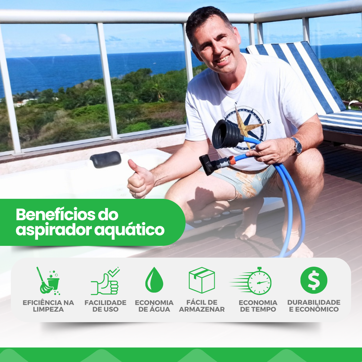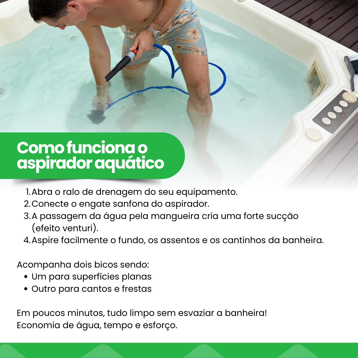 Com o aspirador, a manutenção do seu spa deixou de ser um problema e se tornou um diferencial. Agora, você pode desfrutar de todas as vantagens de uma banheira spa — como hidromassagem, água aquecida e relaxamento total — com a praticidade e consciência ambiental de um consumo de recursos eficiente. O que antes era um ponto fraco, hoje é o seu diferencial sustentável.