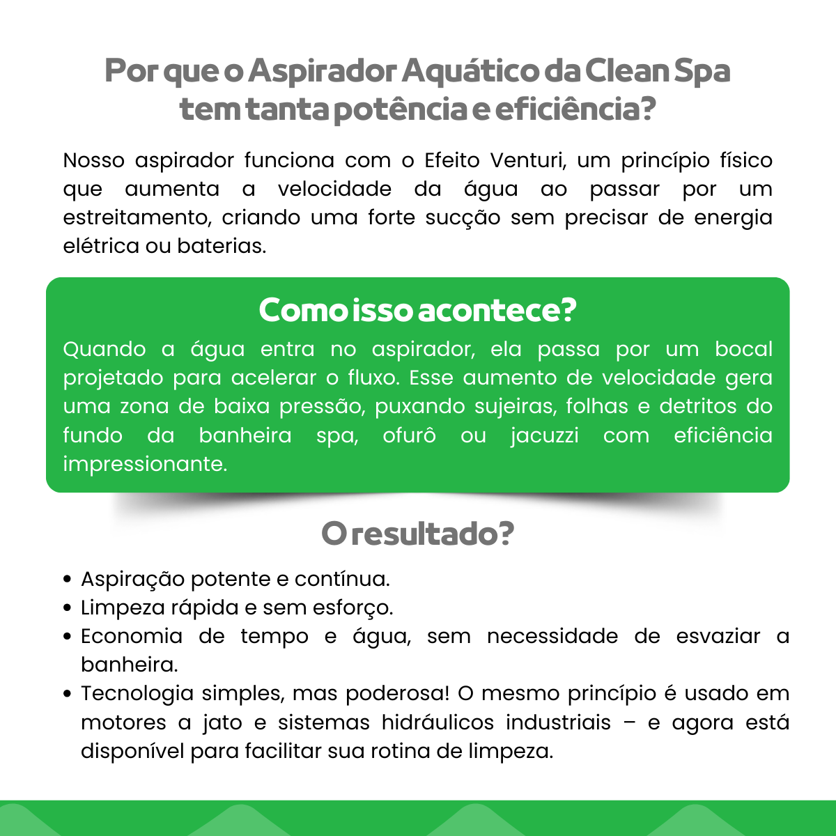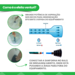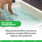 Zero Consumo de Energia: O aspirador funciona com a força de sucção gerada pelo efeito venturi, utilizando apenas a vazão da água do próprio equipamento. Não há necessidade de energia elétrica, bombas, filtros ou qualquer outro acessório.