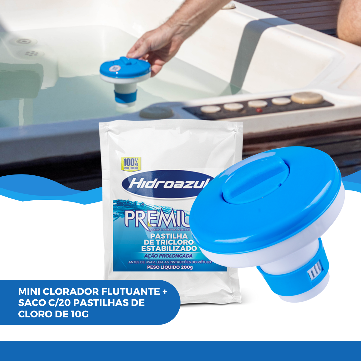 Mini clorador flutuante para acondicionar pastilhas de 10g de cloro de baixa dissolução ideal para o tratamento da água de Banheiras Spas, Ofurôs e Jacuzzis. Vem com um lastro para manter o flutuador no centro da banheira spa.